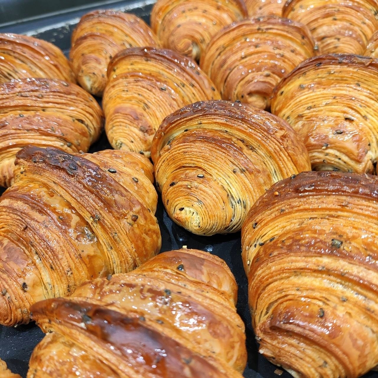 仕込みに3日間かけた、サクッふわっとした食感と発酵バターの香りが漂う、当店自慢のクロワッサン!その生地に黒ごまをふんだんに練り込みました。